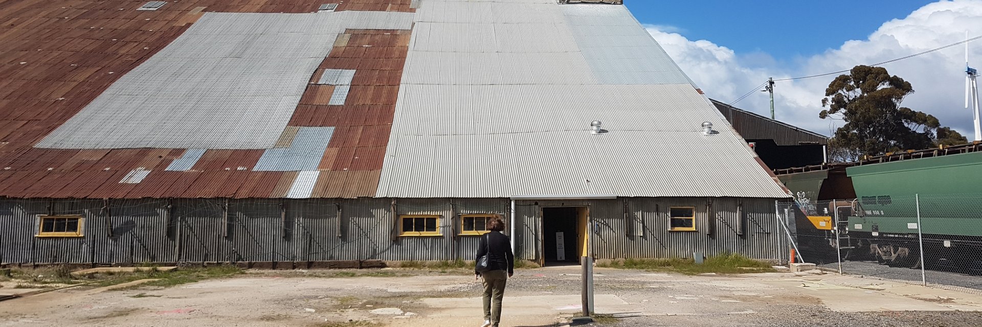 Stick Shed MurtoaBuilt in 1942 completed 1942 265m x 60m x 19m with 560 poles to hold approximately 92.5K Tonnes wheat Panorama of the shed Height at peak 19 metres Wheat emptied from bags and raised to conveyor belt along roof peak Lake MarmaWater Tower Museum